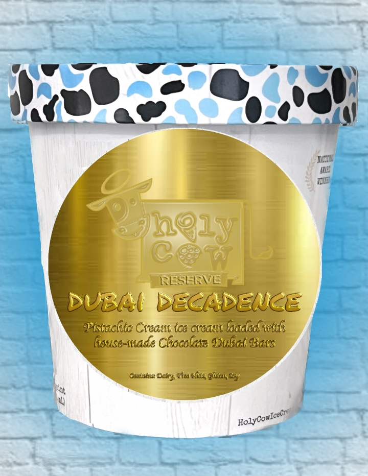 Pistachio Cream ice cream loaded with house-made chocolate Dubai bars Contains: Dairy, Gluten, Soy