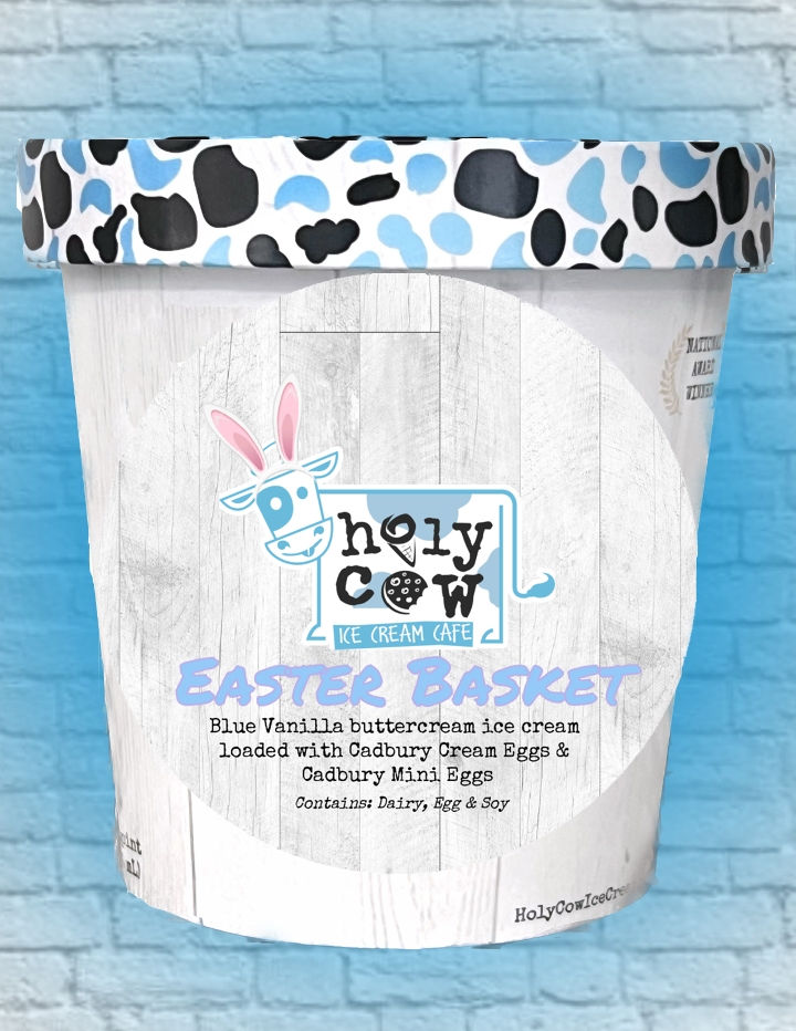 Blue vanilla buttercream ice cream loaded with Cadbury Mini Eggs, & Cadbury Cream Eggs Contains: Dairy, Egg & Soy