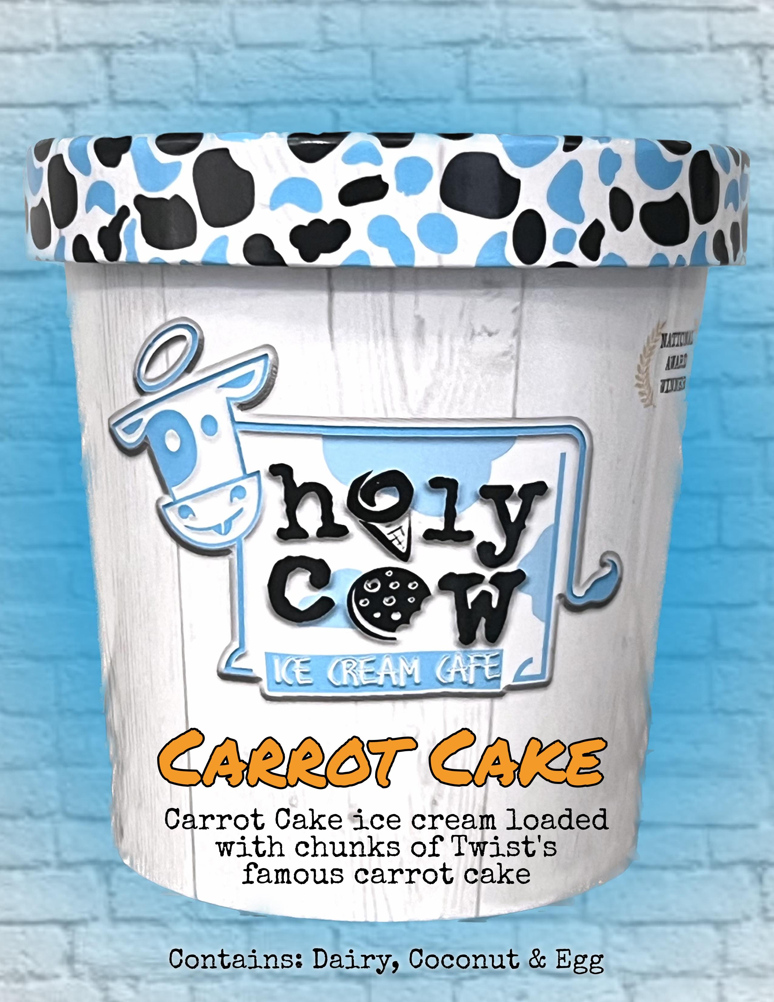 Carrot Cake ice cream loaded with chunks of Twist's famous carrot cake Contains: Dairy, Coconut & Egg